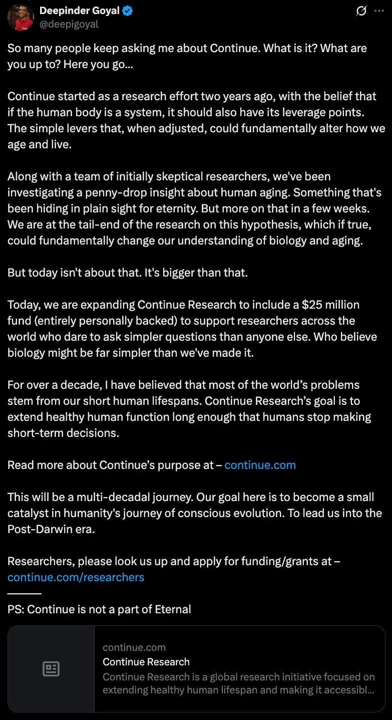 Renowned Indian Entrepreneur Deepinder Goyal Launches 'Continue Research' with a $25 Million Personal Fund to Reimagine Human LongevityContributed by: PR NewswireImagesTagsContinueResearchLaunc